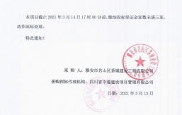 本項目截止2021年2月18日17時00分前,繳納投標保證金家數未滿三家,故作流標處理。特此通知!采購人:雅安市名山區茶城建設工程有限公司采購招標代理機構:四川省中遂建設項目管理有限公司日期:2021年2月20日...